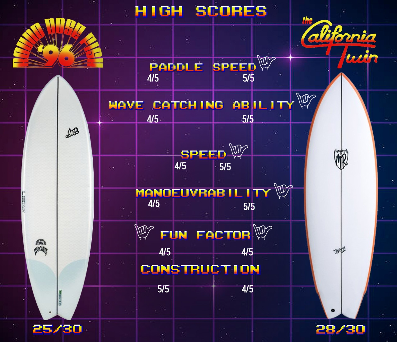 Videos Surfboards Buyers Guide Battle Of The Boards - California Twin vs RNF '96 Back to blog Lost California Twin Vs Libtech X Lost RNF '96 Returning to the most rigorous surfboard battleground of all time, we have another Battle Of The Boards for you. Contending for the crown this time, we have two boards steeped in heritage and prestige. Once again, we have run both boards through there paces and scoring them on our findings and opinions on how we got on. As before, the judging will be on: Boardshop’s team have been trying to find any wave in this summer flat spell, but trips to the Wave Pool along with overseas travel have helped us put there through our paces. So, crack on and look at the boards and then the scoring. The California Twin Under the microscope first, a mash up of shaping greats, THE Mark Richards, the 4 time world champ, who is infamously the twin fin king, worked along with Matt Biolos to create a modern take on a twin fin for the masses. Designed to be an extremely fun and versatile board, the California Twin has been designed to accommodate a twin fin or a twin plus trailer set up, giving you a burst of speed on take off along with the glide and cruise which is synonymous with the old style twin fin shapes. MR and MB have given life to an incredible board. This surprise package of a surf board paddles like a dream, allows you to manoeuvre the board with ease and has a wave range from thigh high to just overhead. well played guys, this is a great board. The RNF '96 Being faced off against the Cali Twin, we have the another Matt Biolos create, this time all by himself. The Lost X Libtech Round Nose Fish 96 (RNF 96) is contender number 2. This new board that is an ode to a classic. Taking a lot from the original RNF tested by Andy Irons and his radical crew, the RNF 96 is a board that works in waves from thigh to overhead. You get a board with the ability to turn hard and go fast! The Libtech construction is undeniably the strongest and most durable on the market and it surfs pretty much like a PU board would under foot. Use this as a twin, twin plus trailer (our suggestion) or a thruster for more performance and you find yourself with no only one of the most fun boards you could ever ride, but also a highly versatile craft too. A tried and tested classic given a modern freshen up and made in world leading tech. Now to dive into scoring: Paddle Speed To start with, paddling is a strength of both boards. The RNF 96 is a touch more puddle in and narrow, giving the Cali Twin the advantage here. Scores are 5/5 from the Cali Twin, and 4/5 for the RNF 96. Wave Catching Ability Similar to paddle speed, the wide point on the Cali Twin is forward of centre and the distribution of foam helps paddle speed which in turn helps wave catching. Again both are very, very good but the scores break down to, 5 out of 5 again for the California Twin. 4/5 for the RNF 96. Speed To clarify, this is speed when up and riding, and both of the boards go like a rocket when you are up and riding, right from the fist second! Nothing beats flying down the line and going fast makes you feel like you are surfing better! Both are quick, the RNF 96 has a touch more control and the Cali Twin is a quicker model. 5 again for the Cali Twin and 4 for the Round Nose Fish. Manoeuvrability Whether we went twin fin only or twin plus trailer, it was almost impossible to pick a board that released and manoeuvred better. The Cali Twin is loose and fast, the RNF similar and has precision in they way you can throw the board around. A solid split of 4.5 point each on this. Fun Factor Under this category, there was no splitting the score. The Cali Twin may have the speed upper hand, btu the fun you can have on the RNF 96 was immense. You feel like you can whip this board around with ease and you will never not be smiling! The Cali Twin is close behind but the Cali Twin take a 4/5 here and the RNF 96 gets a 4.5. Construction Only one winner. PU boards are amazing, loved by many, but there is no construction other than Libtech that gives you that classic PU feel when you are surfing but takes all the worries away for dings. 5/5 for the Libtech model, the Cali Twin takes a 4. Result Firstly, we have two new favourites of the shop here. Very hard to split overall but taking the win is the Lost X MR California Twin. Watch The Battle Of The Boards Video! Check out the full range of Lost X MR California Twin's and Libtech X Lost RNF 96’s in store right now by clicking on the images and decide for yourself! Back to blog