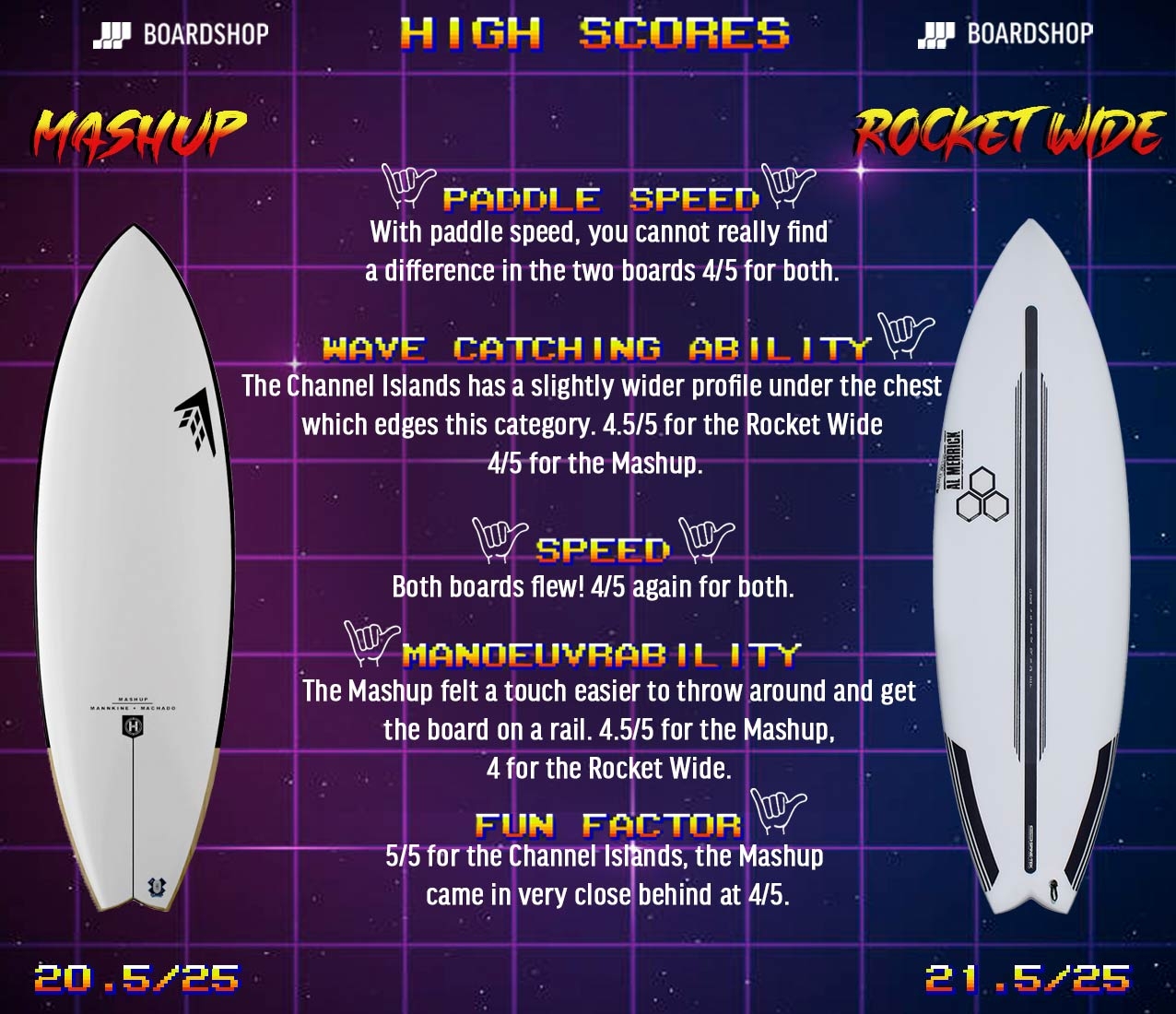 Videos Surfboards Buyers Guide Battle Of The Boards - Mashup vs Rocket Wide Back to blog Firewire Mashup Vs Channel Islands Rocket Wide Battle Of The Boards from Boardshop is the ultimate test of two surfboards! This instalment pits the collaborative creation between Rob Machado & Dan Mann, the Firewire Surfboards Mashup against one of the best “go-to” hybrid boards of today, from Britt Merrick and the Gudauskas brothers, the Channel Islands Rocket Wide. Once again, we have run both boards through there paces and scoring them on our findings and opinions on how we got on. As before, the judging will be on: Bordshop’s team have been making the most of the winter waves we had, the local has been lacking but we have been travelling west to put the boards through their paces! So, lets dive into the boards and then the scoring. Firewire Mashup Stepping into the ring, the hybrid board that will put a spark back into your surfing in even the most uninspiring waves, we have the Firewire Mashup. A strong contender for the board of 2022 already. Designed as a board to do it all, this can cover you for a “performancy” small wave board, but it will also cover you as a go to daily driver. Blending two of the most successful Firewire models in recent times, the Seaside and Spitfire, this mash of the minds has delivered a versatile little weapon that covers you in waves from thigh high to overhead. Machado and Mann have crafted a super intelligent board that will have you stoked to surf in all types of waves. The outline, foam distribution and dimensions all add up to give you a super good paddling board that carries speed with ease and lets you check off a few turns too. Channel Islands Rocket Wide Up against the Mashup, fighting out of the opposite corner, we have the Rocket Wide from Channel Islands. Britt Merrick’s take on a hybrid board that gives us performance and fun. When you pick this beauty up and place it under the arm it feels “just right”. The balance in the board just gives you the feel of a board that will go in almost any wave and it will be extremely fun and playful. Channel Islands have given the Rocket Wide has an outline and profile that allows the board to take on waves from 1ft to 5ft. A fast-paddling board that has plenty of spark and manoeuvrability with the ability to hold in a bigger swell too. A true trusted surfboard that can handle a huge array of wave conditions, types and size. Now to dive into scoring: Paddle Speed With both of these boards being so similar in shape and outline, a lot of the results are going to be very close. With paddle speed, you cannot really find a difference in the two boards. Both will have you stroking into almost anything that looks like a wave from just over knee high up to just over head. 4/5 for both! Wave Catching Ability Like with the Paddle Speed, both of these boards share very similar entry rocker profiles, which allows the to stroke into waves with ease. They are crazy good. The Channel Islands has a slightly wider profile under the chest which edges this category. 4.5 out of 5 for the Rocket Wide. 4/5 for the Mashup. Manoeuvrability Here is where we found a small difference in the boards. The Mashup felt a touch easier to throw around and get the board on a rail. Don’t get us wrong, the Rocket Wide has bags of performance and was still sharp and responsive underfoot, we just felt the Mashup rolled over rail to rail a touch easier. For that we have given the Mashup 4.5 out of 5 and the Rocket Wide 4. Speed To clarify, this is speed when up and riding, and both of the boards we had under foot flew! I can say they made our surfing feel better than ever just by generating speed and allowing the test pilots to focus on performing rather than hopping to generate speed. All the attributes lead towards a fast board, with the concaves and rocker working together. We could not split the boards on this test, so 4/5 again for both. Fun Factor This was one area we could not give the same score on both. Simply thanks to the tail giving us a feel that the board can be whipped around a touch easier and faster, the fun on the Rocket Wide was at another level! 5 out of 5 for the Channel Islands, the Mashup came in very close behind at 4/5. Watch The Battle Of The Boards Video! Check out the full range of Channel Islands and Firewire Surfboards online now! Back to blog