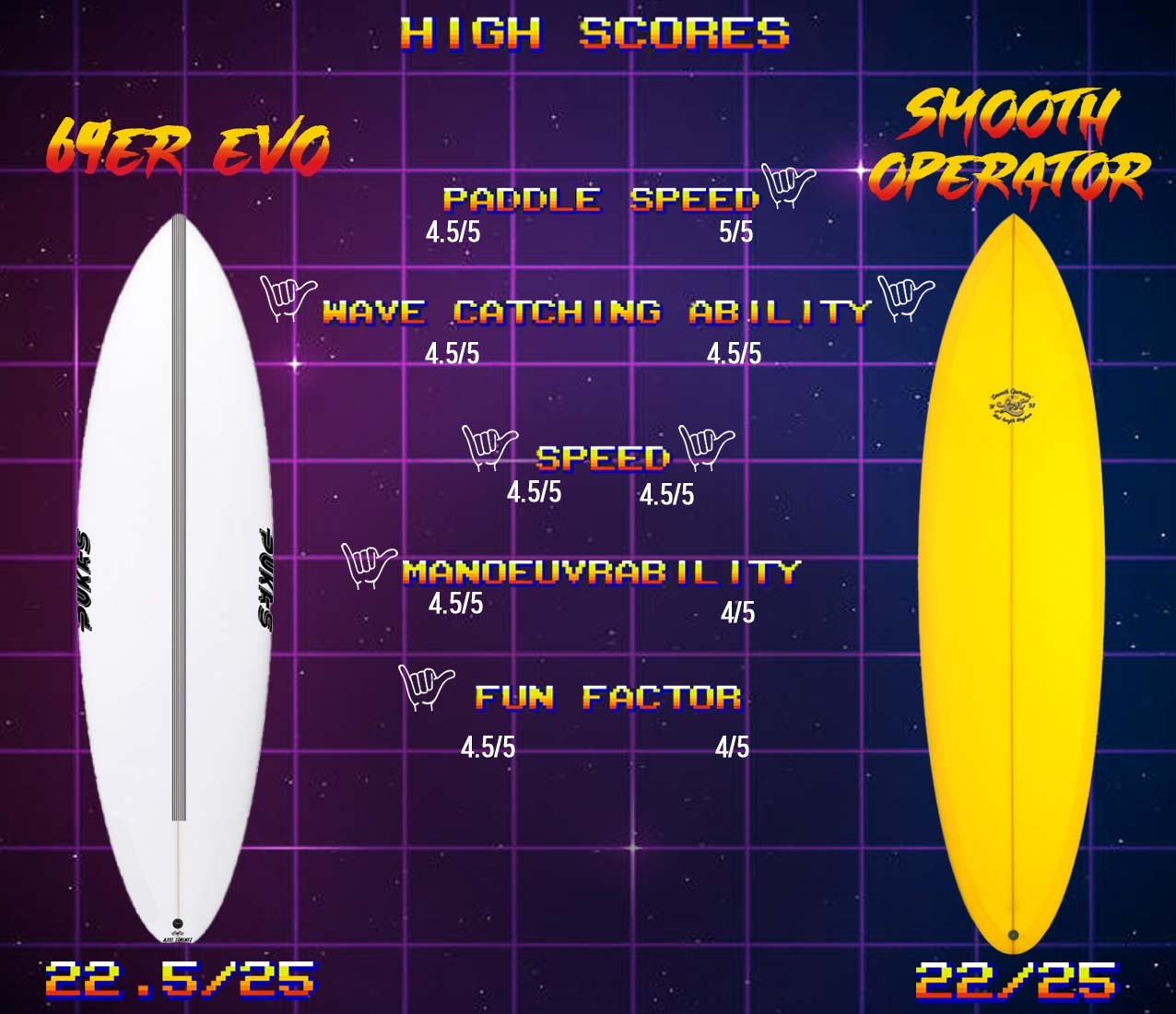 Videos Surfboards Buyers Guide Battle Of The Boards – Smooth Operator VS 69er EVO Back to blog Lost Smooth Operator Vs Pukas 69er EVO Once again at Boardshop we are pitting two boards against each other in the Battle of The Boards. Against various criteria these two amazing boards are scored and ranked to determine a final winner. This time around the two boards stepping onto the Battleground: The Lost Smooth Operator and the Pukas 69er Evolution. As always, we have run both boards through their paces, scoring them on our findings and reflections. As before, the judging will be on: Taking advantage of winter waves with more consistent swell, the team at Boardshop have been able to really get to grips with these boards and test them out in a wide range of conditions. Now, onto a bit more about the two boards & the scores. Lost Smooth Operator Let’s look at the Lost Smooth Operator first. This is Matt Biolos’ answer to ‘a do it all’ mid length and is the board he surfs personally more than any other, especially according to his Instagram! Matt may shape for some of the best surfers on the planet, but that doesn't mean he is one of them. He can surf for sure (but like many of us he is getting older) and surfing for him is all about fun, catching the most waves and most importantly making the most of those waves. That is exactly what the Smooth Operator delivers. An outline that blends a look of a traditional egg with a modern drawn-out hybrid board, the simple sleek design means you have a board that is silky smooth through turns and manoeuvres. It paddles very well and can be used in a vast variety of waves sizes and styles. Designed as a 4+1 set up, the versatility this gives is subtly ingenious. The quad allows for more speed and drive in small weak waves. On the other hand, the 2+1 gives you the confidence that the board can pivot and turn (rivalling a thruster) along with more control, which helps in bigger waves. Pukas 69er Evo Across the ring, we have the Pukas 69er Evolution. Derived from the much-loved Pukas Sixtyniner Original, Axel Lorentz, stretched out his classic template while fine tuning the dimensions to deliver the 69er Evolution to us. A brilliant all-round board that is ideal to take on a huge range of conditions, meaning the Pukas is an outstanding choice when wanting a one board to rely on, either at your local or when travelling. Unlike other boards in of this style, the 69er Evolution is given a 5-fin set up, rather than a configuration centred around a larger centre fin. By doing this, Pukas give anyone riding a 69er EVO the choice between a fast, loose and driving feeling by using a quad set up, or a controlled and consistent ride when using a 3-fin configuration. The outline, rocker and rail profile on the Pukas 69er Evolution all combine to ensure that whether you are surfing slack, rolling waves, or fast-moving hollower waves you know you can rely on this model to work. The wide point is forward of centre to give you phenomenal paddle speed. This working in conjunction with a pulled in tail and profiled down rail edge allows for performance and control too. Therefore, this is effectively the surfboard version of a multi tool. Now to dive into the scoring: Paddle Speed Both models possess very good paddle speed. You will be upping your wave count whichever is your pick. The Lost has a slightly fully outline under the chest which gives this the win. Scores are 5/5 from the Smooth Operator, and 4.5/5 for the Pukas. Wave Catching Ability Much like the Paddle Speed, both of these boards are wave catching weapons. With outlines that are similar, both boards are high scores in this section. We can’t split them so 4.5/5 for both boards. Speed When you are up and riding, on either model, you have the ability to really pick up speed with ease. So, both are fast and fun models. Setting them both up as a quad fin will give you the most speed. Without a speed gun it’s impossible to pick a winner, so 4.5 again for both. Manoeuvrability Again, with the right fin choice, both boards turn hard and fast and react to where you want them to go. The Pukas 69er Evolution does have an edge in the performance and manoeuvrability category for sure. The Pukas takes a 4.5 whereas the Smooth Operator scores a healthy 4. Fun Factor The fun factor in both boards deserves a 5 out of 5, but when comparing to others, we need to try and pick a winner, right? Very slightly edging the win is the Pukas as it can almost do all the Lost model can but with more ability in the performance ranks the fun level can be notched up. Pukas’ 69er Evolution scores a 4.5 while Matt Biolos’ Lost model gets a 4 out of 5. Result The two models where already strong favourites here at Boardshop. Taking the win, by a tiny margin, is the Pukas 69er Evolution. But the real winner here is anyone that gets to surf either of these boards! Watch The Battle Of The Boards Video! Check out the full range of Lost Smooth Operators and Pukas 69er Evolution’s in store right now by clicking on the images and decide for yourself… Back to blog